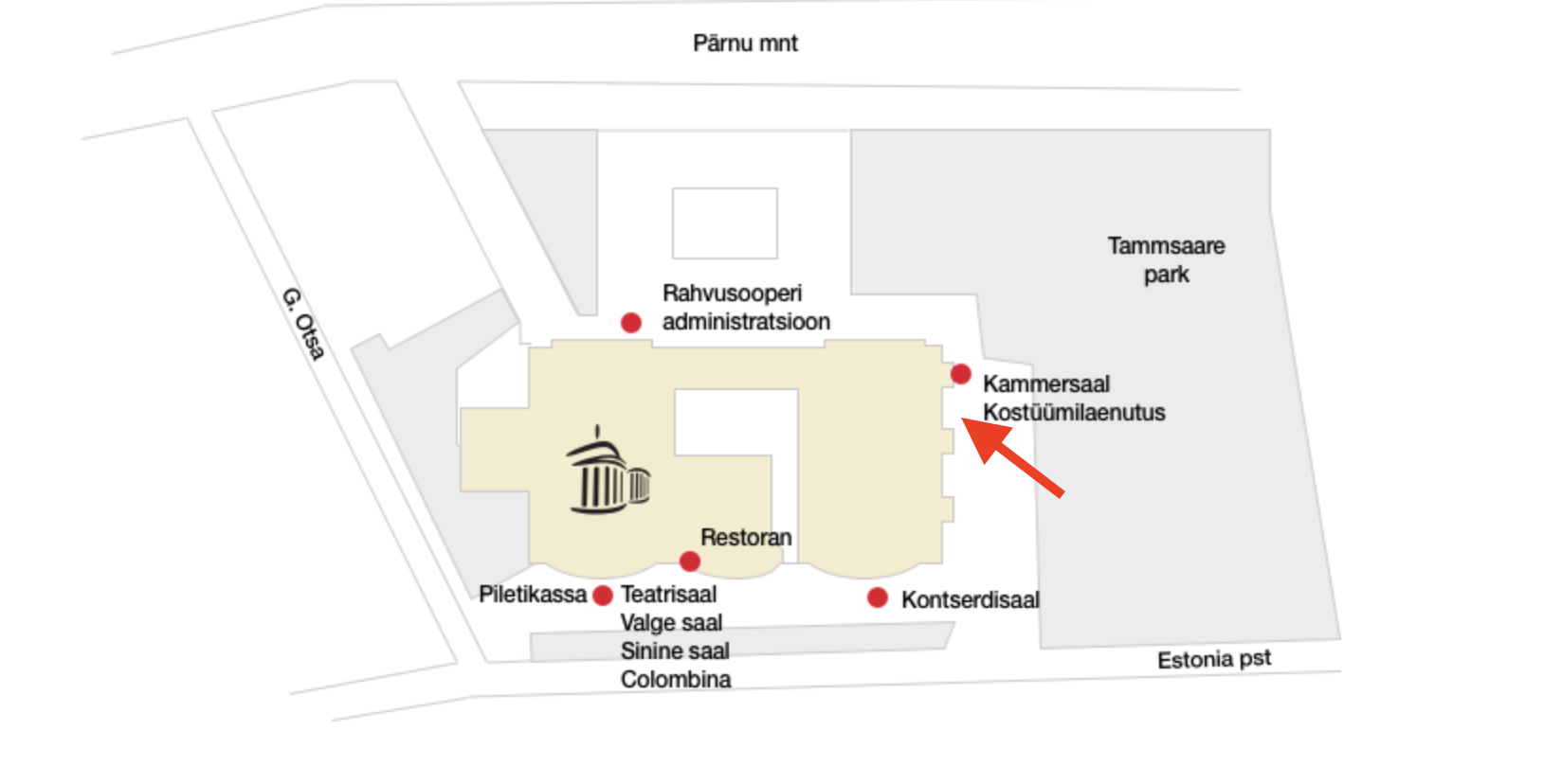 Estonia kostüümilaenutus asub Estonia teatri majas, Estonia pst 4, sissepääsuga Tammsaare pargi poolt
